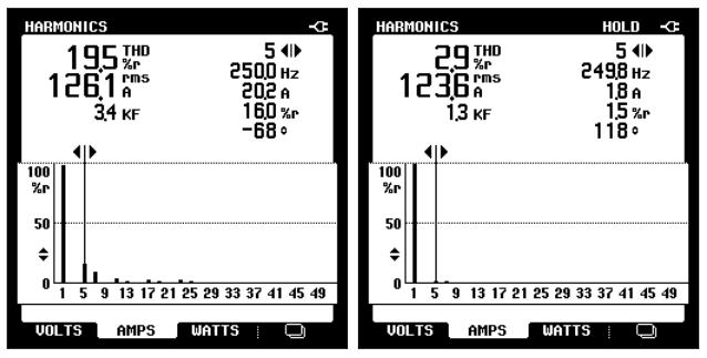 根據(jù)我司技術(shù)人員的測試分析后,決定安裝7臺有源電力濾波器分別用在兩個配電室:一號配電室兩臺,二號配電室5臺,每臺濾波器對應(yīng)一條“打葉線”,這樣的配置就可以達到有效抑制諧波,改善電網(wǎng)電能質(zhì)量的目的。治理效果如下圖所示: